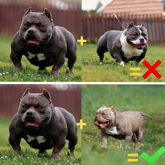 Поэтому мы подбираем к сухому, рельефному и экстремально мышечному партнёру более мягкую, но при этом крепкокостную пару — и получаем идеальных, сбалансированных булли: мышечных, но при этом подвижных и здоровых.