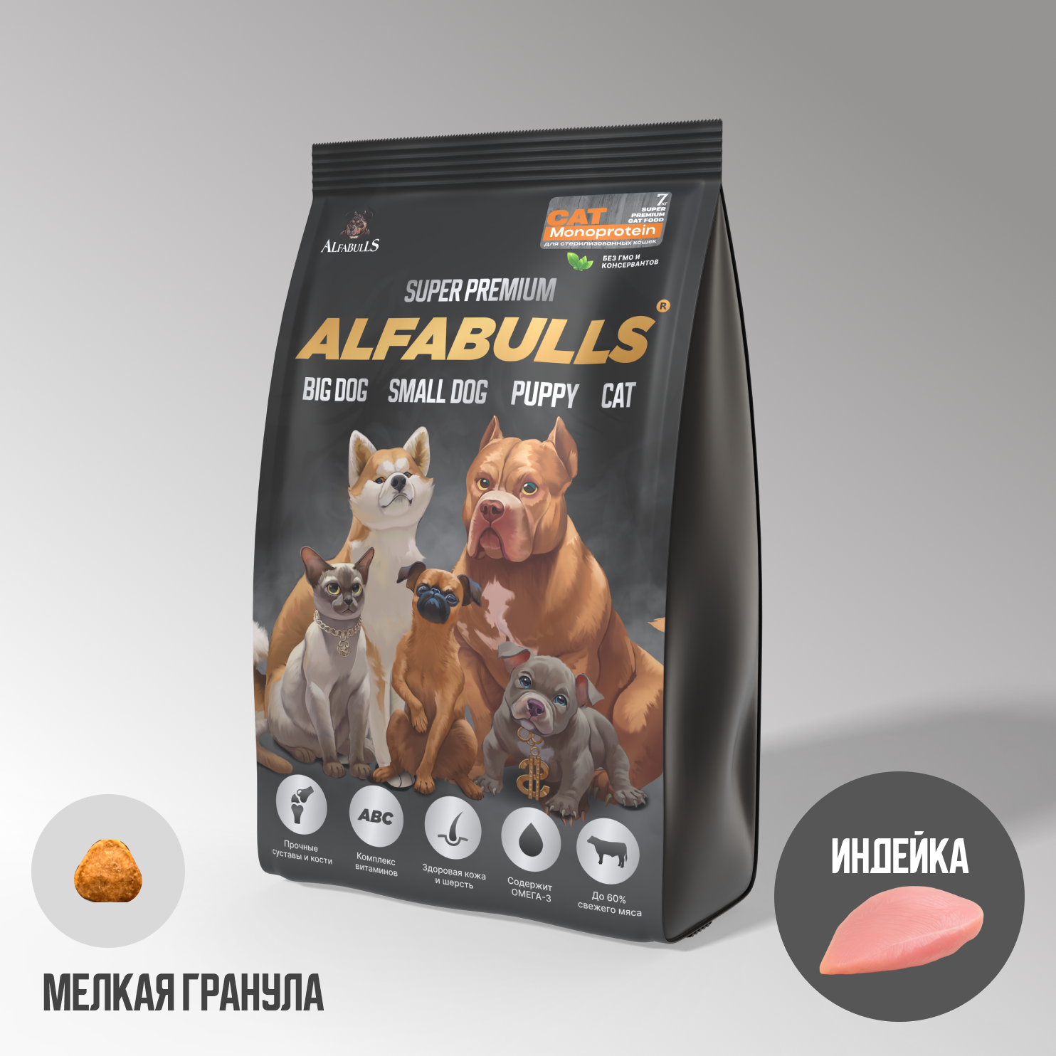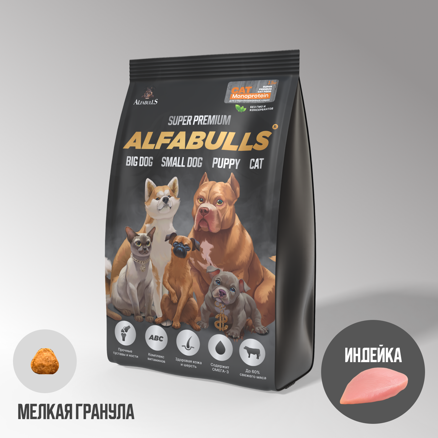 Общий процент мясного составляющего – 61%. Подробнее: Мясо индейки - 19%, Cубпродукты индейки [печень, сердце, желудок] – 17%, Сублимированное мясо индейки высшего сорта – 11%, Филе рыб лососевых пород – 7%, Сублимированное филе рыб осетровых пород – 7%], дегидрированный хрящ рыб осетровых пород и визига, рис, рис бурый нешлифованный; овсяные хлопья; жир индейки; Жир из печени Катрана, Масло лососевое [источник Омега 3,9], Масло оливковое Экстра Вирджин, Яблоко [источник клетчатки], Морские водоросли [источник йода], Цельное сухое яйцо [высококачественный источник белка], Экстракт бархатцев [источник лютеина], Экстракт зеленого чая [источник антиоксидантов и витаминов], Плоды Сигизиума [натуральные антиоксиданты, обладают противовоспалительными свойствами], Морковь, сладкий зеленый перец, томаты, кабачок, листья салата, семена льна, тыквенные семена, спаржа, шпинат, листовые овощи, рябина, расторопша, куркума, ромашка, крапива, брусника, пророщенный овес, мята перечная, корень цикория, топинамбур, крапива, шиповник, Пивные дрожжи, [натуральный пребиотик], Итальянский витаминно-минеральный комплекс, Экстракт Юкки Шидигера [для уменьшения запаха экскрементов], L-карнитин, Таурин.