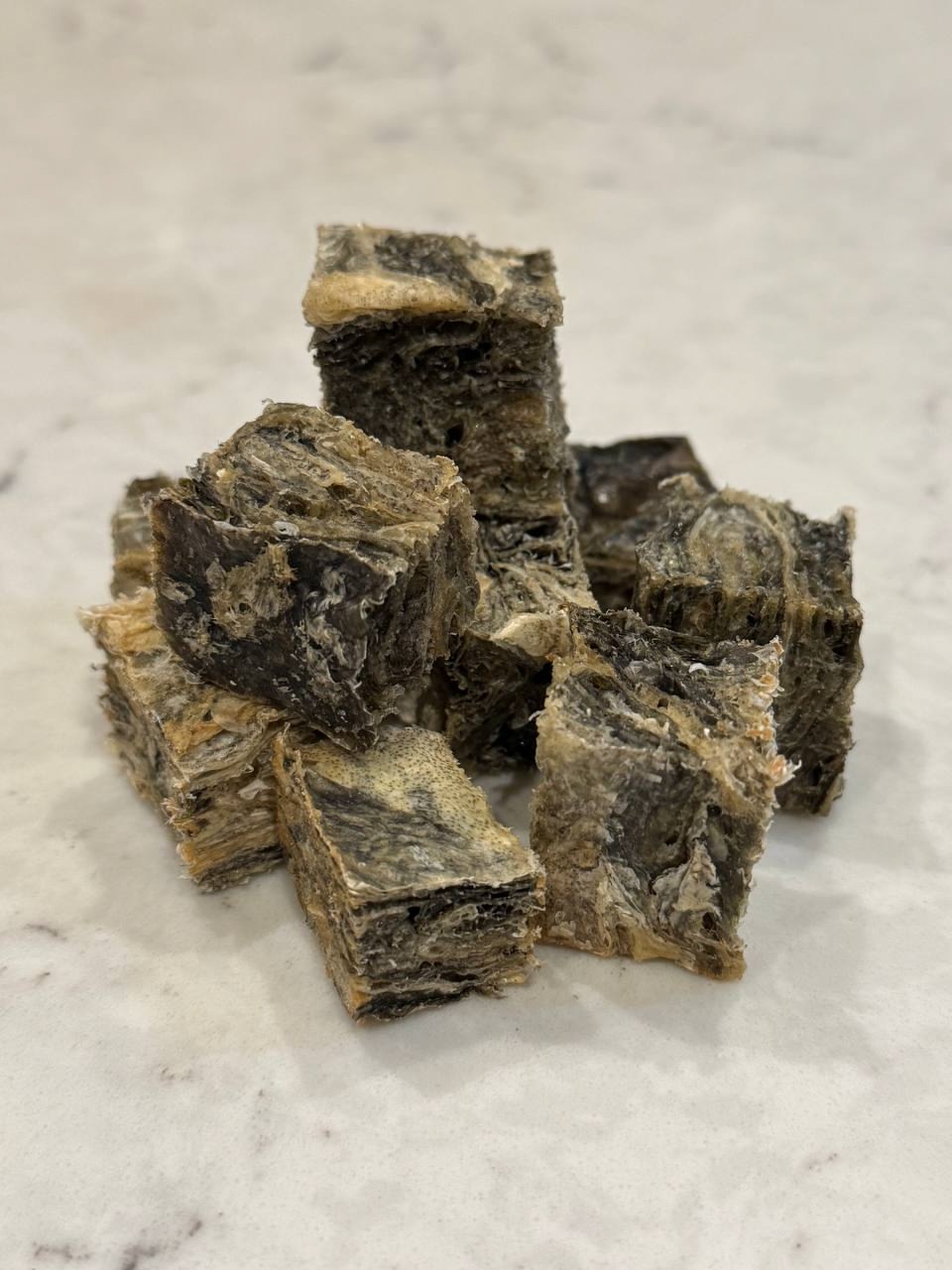 🐟 Кусочки из кожи трески — сухая, хрустящая награда для всех собак Тресковая кожа — лёгкое, но долговечное лакомство. Пахнет рыбой, приятно хрустит, не оставляет химических привкусов. ⭐ Зачем нужны кусочки ✔ Лёгкая, но плотная структура Не настолько жесткая, как некоторые хрящи, но намного интереснее обычных печений. ✔ Отличная чистка зубов Хрустящие части при жевании снимают налёт, помогают в уходе за зубами. ✔ Вкус, который любят многие Рыбный аромат вызывает интерес и быстро «работает» как мотивация или премия. ✔ Подходит всем размерам Можно делить на кусочки, чтобы подстроить под любую собаку — от маленькой до крупной. 🐕 Кому подходит ✔ Любым породам ✔ Щенкам с привычкой к рыбе или любителям морских вкусов ✔ Владельцам, которые хотят натуральную и не слишком жёсткую жевалку 🍖 Норма потребления — До 10% от дневной нормы. — При 300 г корма — не более 30 г лакомств.
