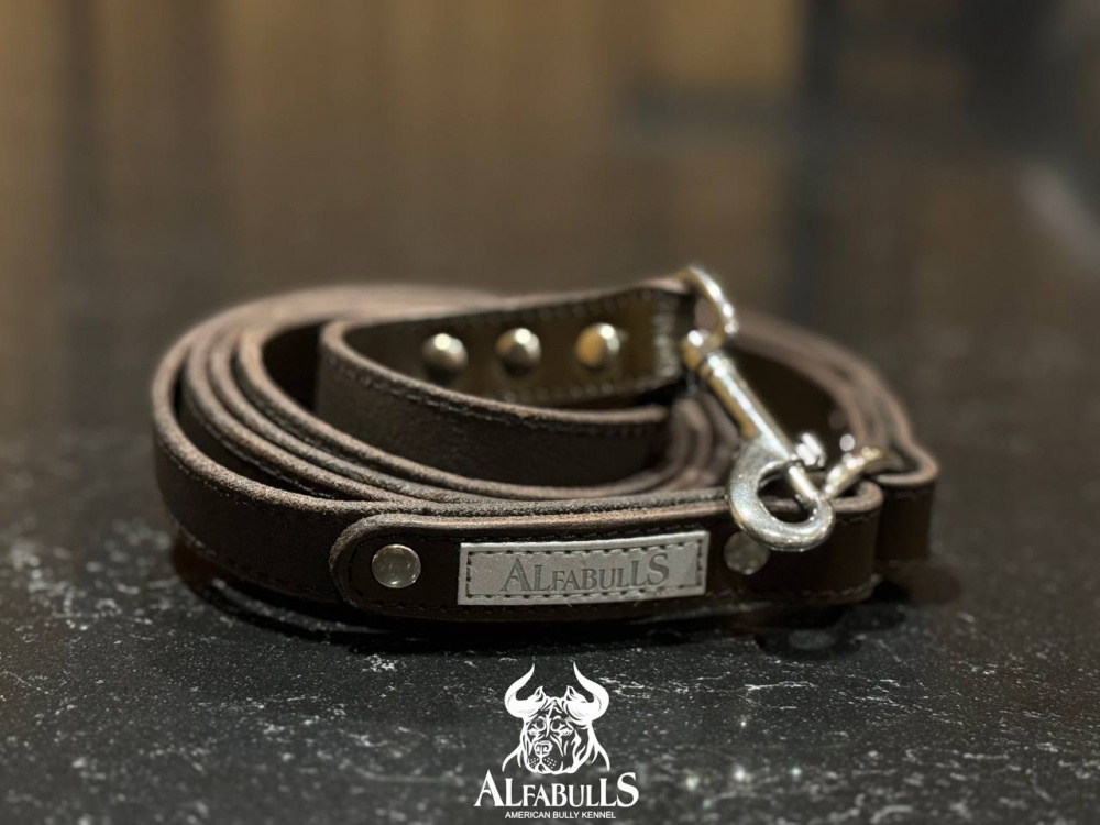 Поводок AlfaBulls из натуральной кожи, 1.8м, коричневый Чёрно-коричневая кожа класса "Люкс". Благодаря активной пропитке маслами, эта кожа имеет очень высокую износостойкость и приятно ложится в руке. Этот вид натуральной кожи используется специально для поводков и ошейников, которые предназначены для экстремального использования. С течением времени использования кожа становится ещё мягче и эластичней. Поводки из неё способны служить долгие годы, становясь со временем только лучше. Поводок длиной 1.8м, одна из самых оптимальных длин для комфортной прогулки. Если вам необходим поводок большей длины, напишите нам, мы сделаем его на заказ! Классические карабины Итальянского производства сделаны из латуни или нержавеющей стали, способны выдержать нагрузку свыше 300кг.